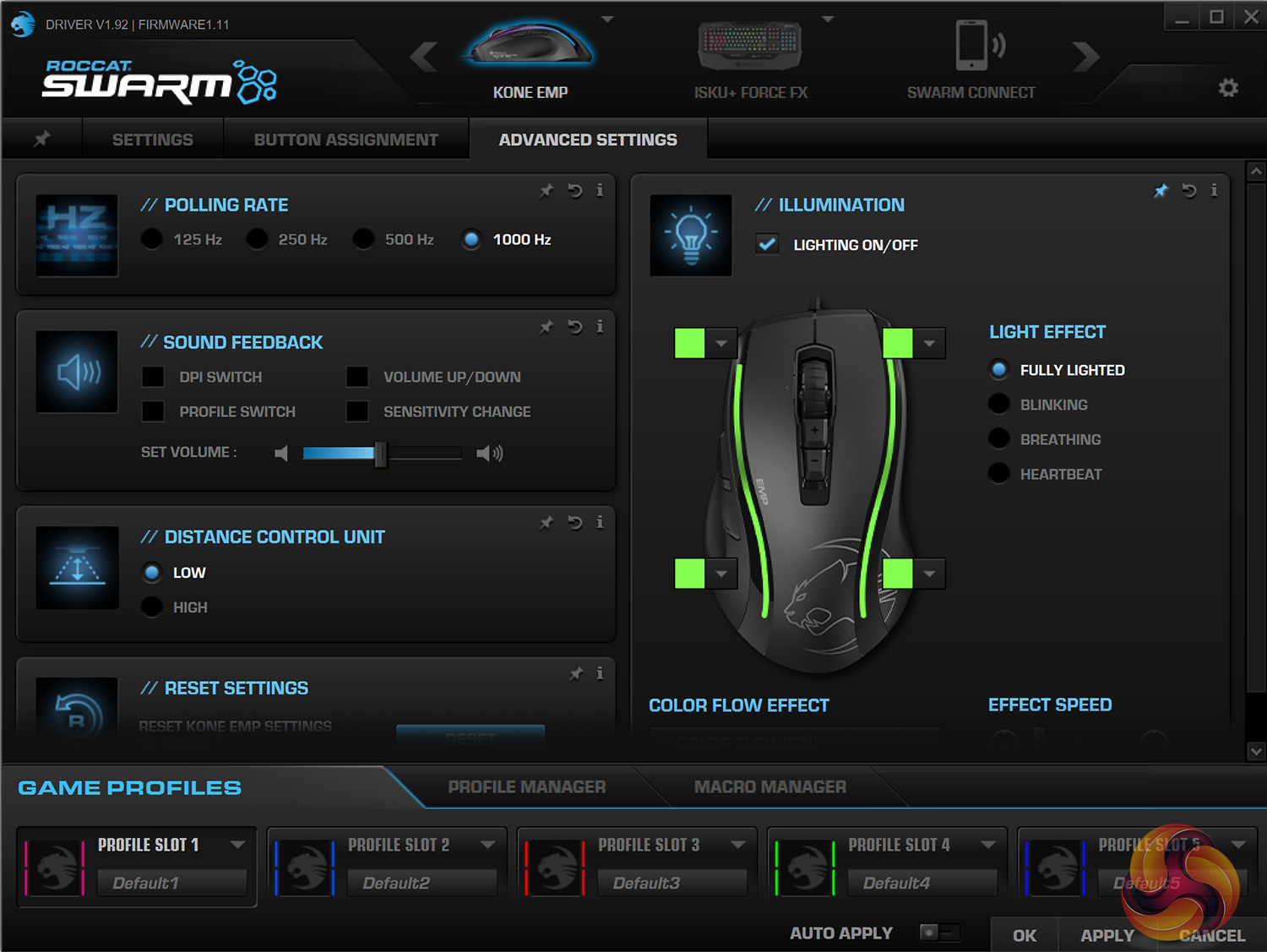 The lighting is particularly interesting as the Kone EMP has four separate LEDs (one at either end of the two LED strips) which can be independently programmed. This means you can set two different colours to be on the same LED strip, and watch them come together in the middle (something I demonstrate below.)