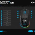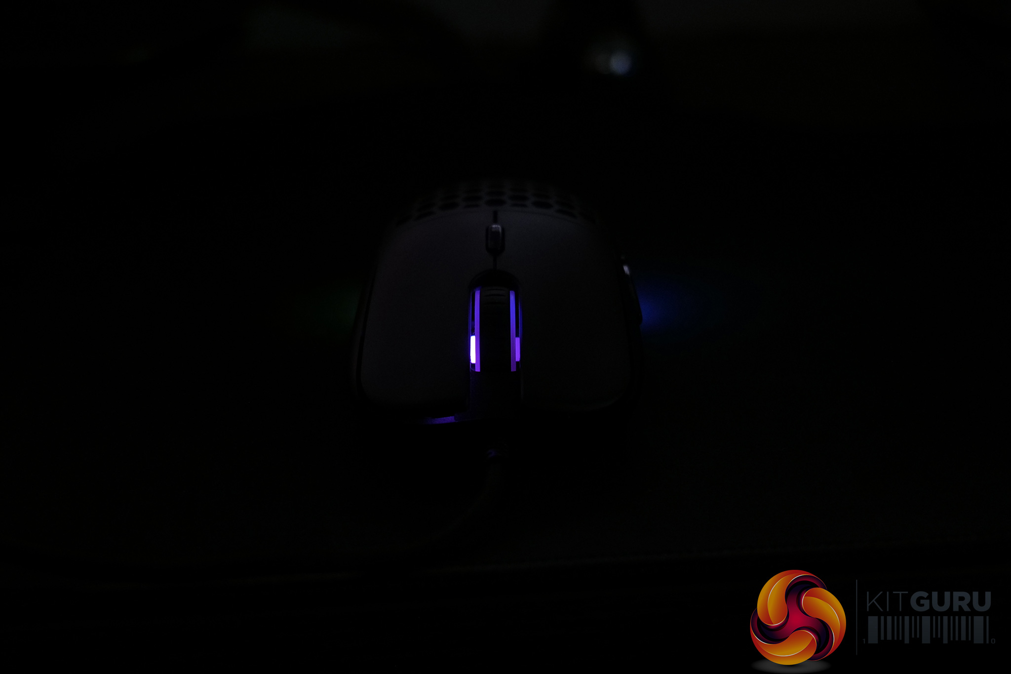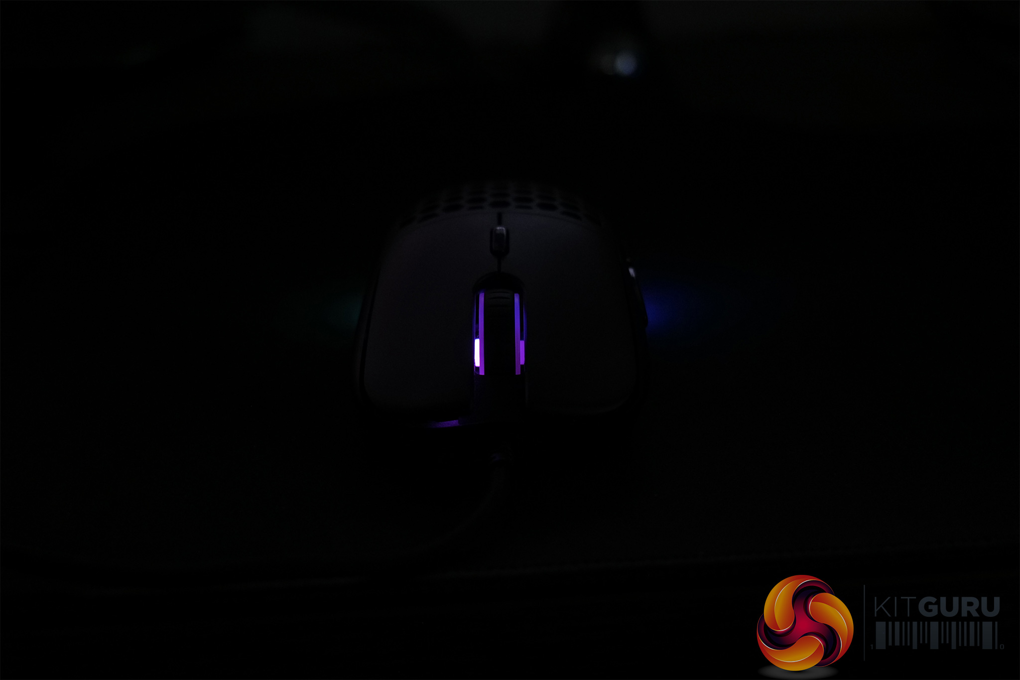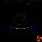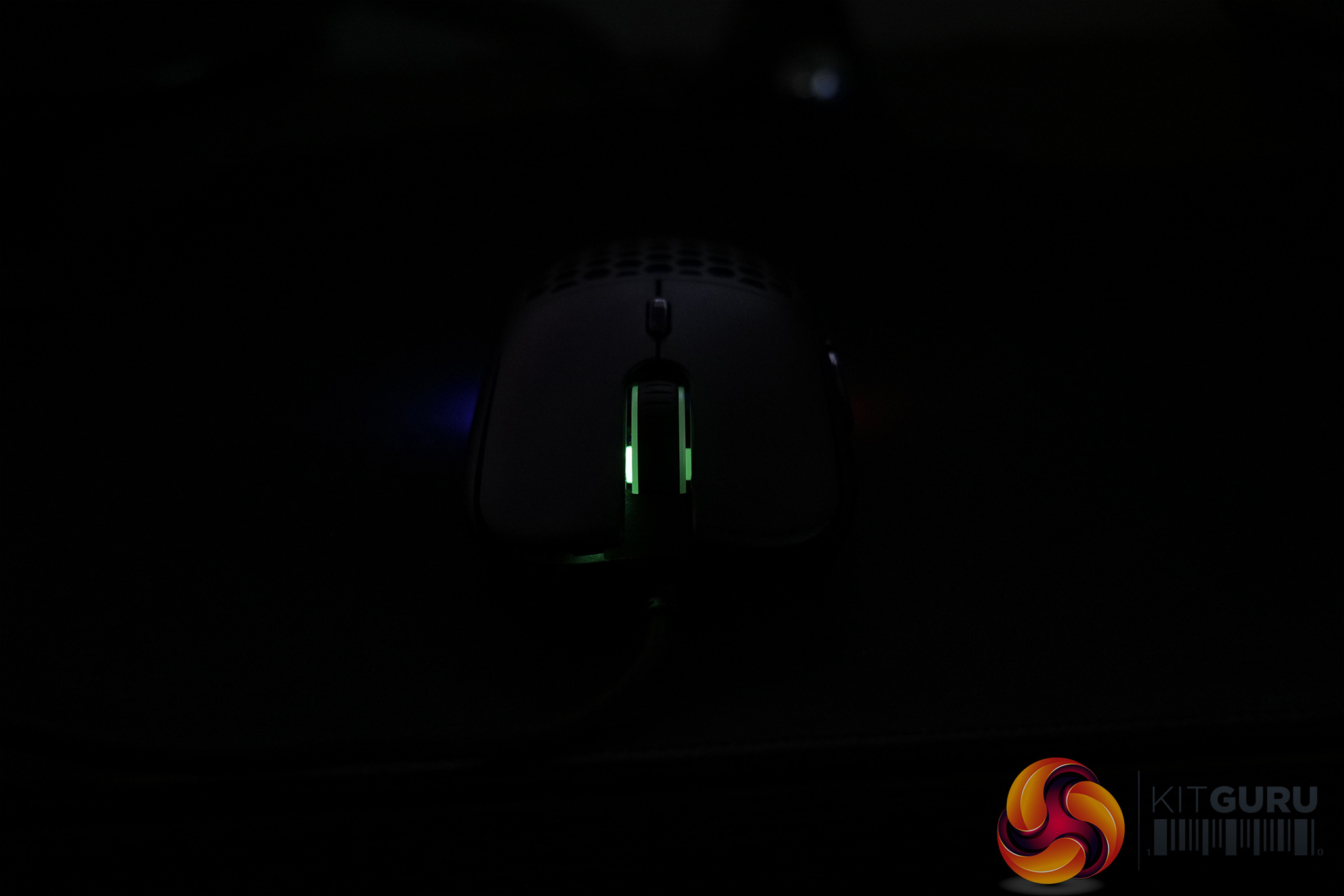 There's three different areas with RGB lighting on the Light2 180 – the scroll wheel, the Sharkoon logo underneath the top shell, and a small LED strip at the very back of the mouse. All three areas are treated as a single zone however, so you can't set the scroll wheel to one colour and the Sharkoon logo to another.