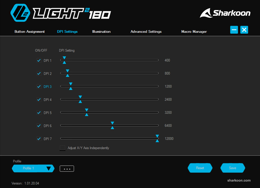 - DPI Settings enables you configure up to 7 DPI stages, adjustable in increments of 100.