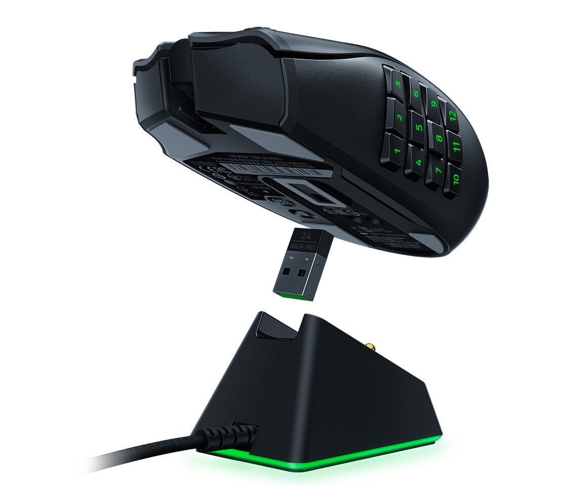 Like other Razer HyperSpeed wireless mouses, the Naga Pro is very power efficient. With up to 100 hours of continuous operation on 2.4GHz, and 150 hours on Bluetooth, you can still game with it while charging with the included Razer SpeedFlex cable. You can also charge it through the Razer Mouse Dock Chroma (not included).