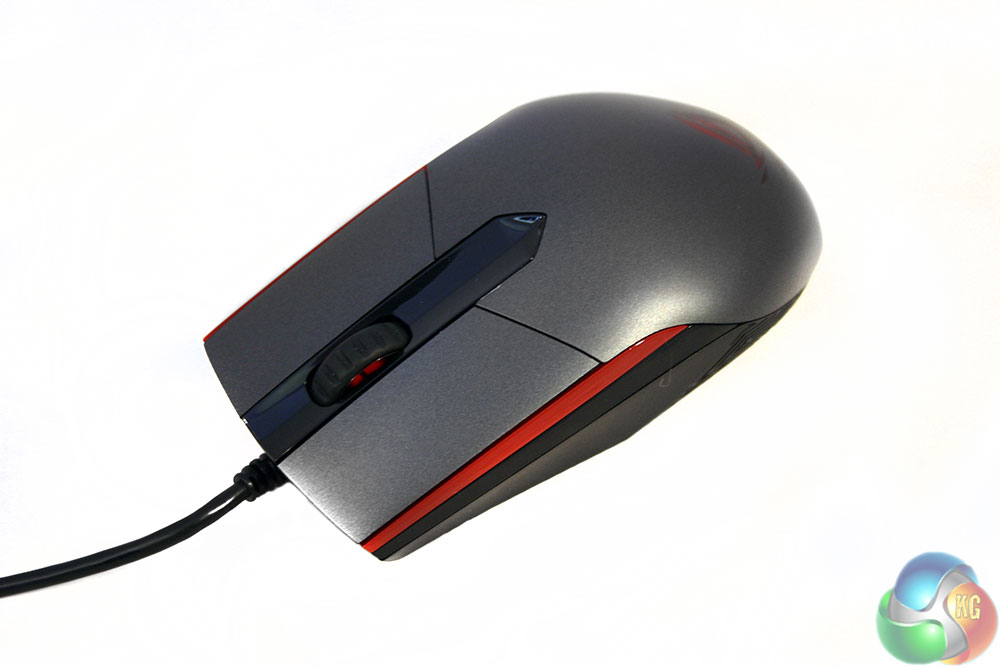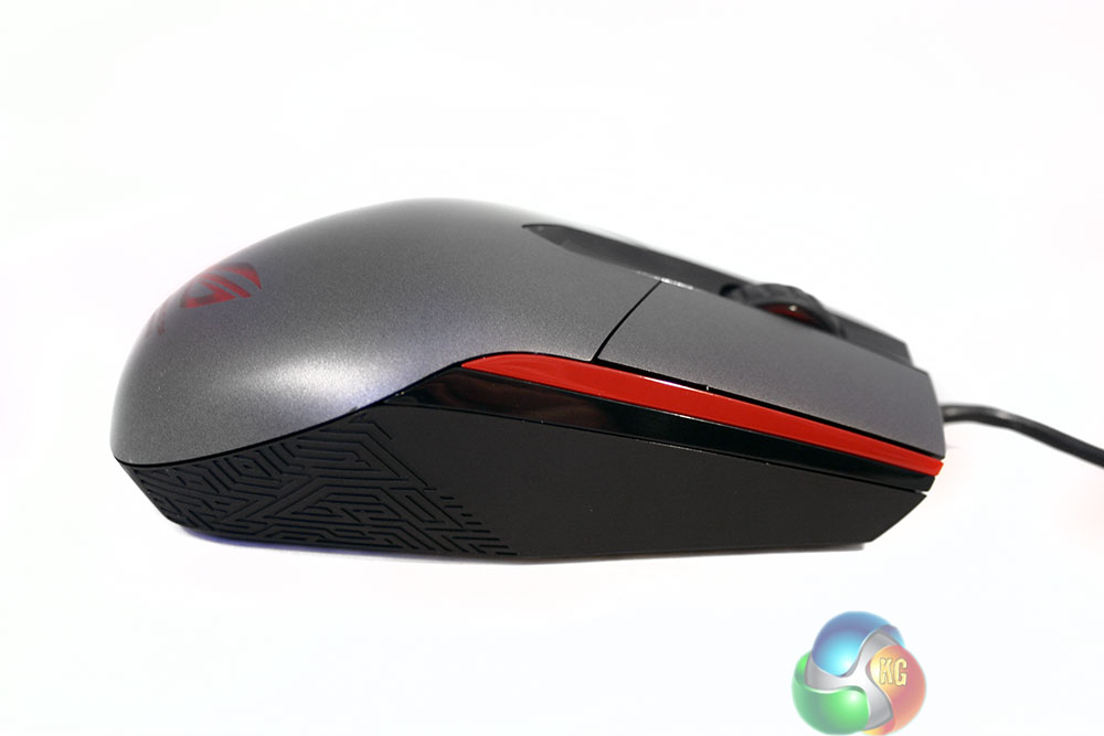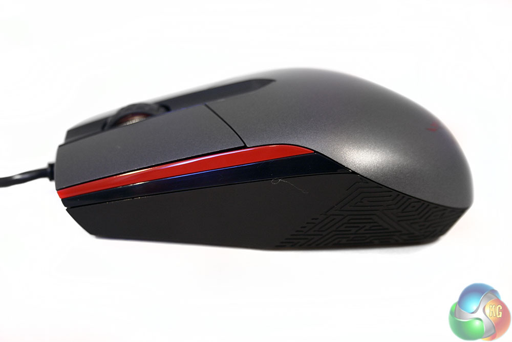 The Sica mouse is certainly very stylish. It features very little in the way of colourful styling and instead has a slate-grey body, split into distinct sections. The only obvious styling is an illuminated ROG logo on the palm rest of the mouse, and two twin red bands running down either side.