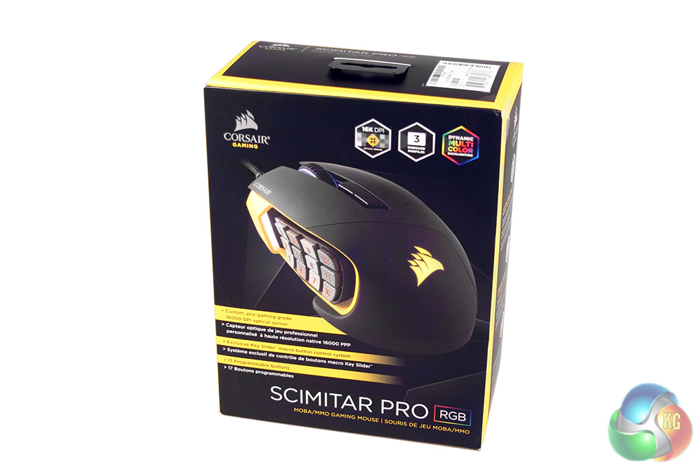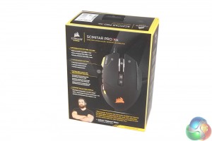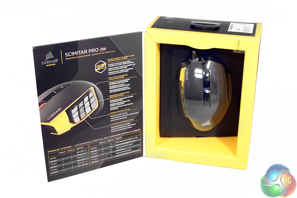 The packaging for the Corsair Scimitar Pro RGB is of the same sort of quality we have come to expect from Corsair: stocky, black and accented with colour (the yellow itself a refreshing change of pace from the usual gaming red) as well as high-quality imagery. This box does not disappoint, giving us a run down of the most important features, as well as a close up look at the Scimitar Pro itself.