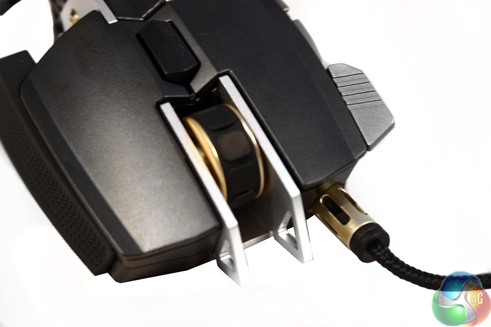 A couple of other features worth noting though, is the central aluminum frame surrounding the scroll wheel. When powered on, this area lights up thanks to a customisable LED inside (see later for lighting shots). You might notice also, that the mouse's cable is located to the side, not the center and given a much sturdier housing. This is to prevent the cable and its connector becoming damaged over time.