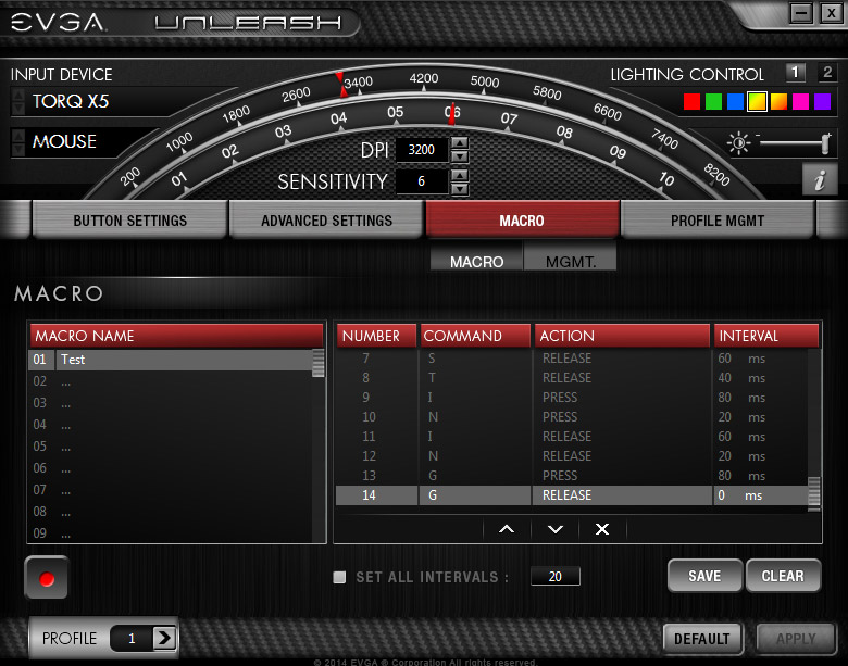 Macros can be recorded, with intervals adjusted and they can be stored on the mouse or on a local drive