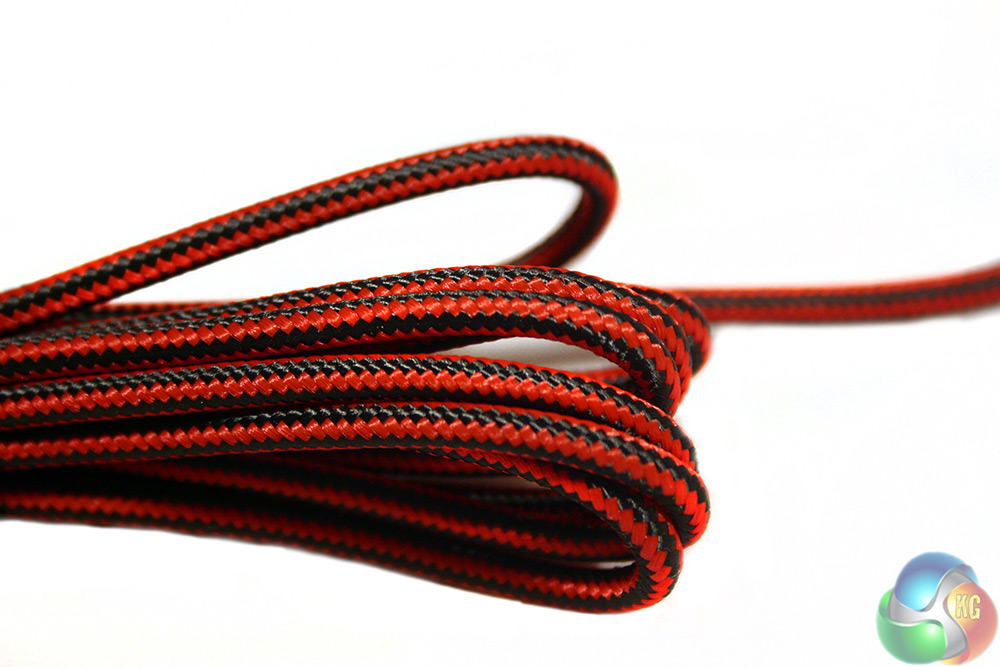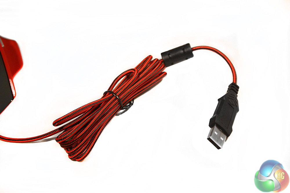 The cable is braided red and black, with a standard, nickel plated USB header at the end.