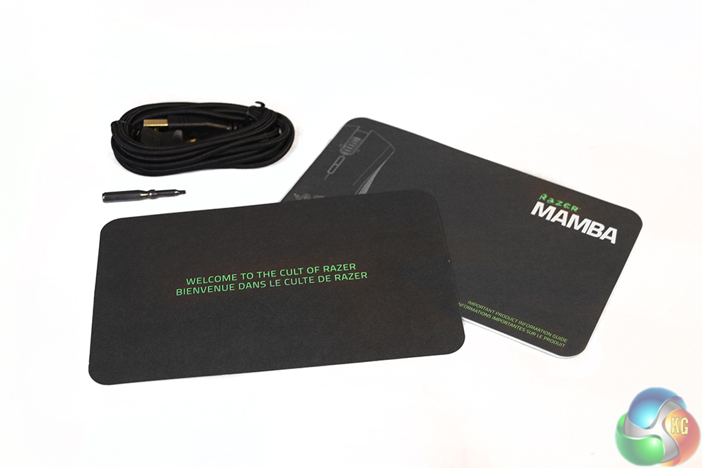 Along with the mouse itself, there is a manual, a quick-start guide sheet, a micro-USB cable with a unique header for attaching the mouse in wired mode, and powering the accompanying dock, along with a unique hex-head screwdriver.