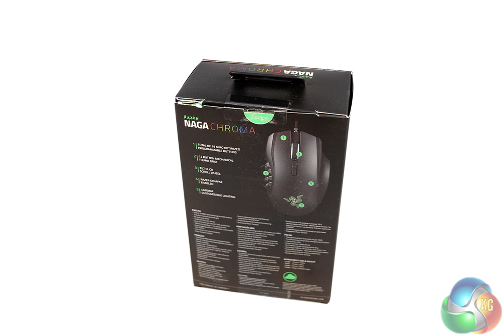 Packaging for the Razer Naga Chroma 5G MMO is very much like some of the other Razer products we have reviewed as of late. It flips open at the front to showcase the mouse and breaks down some of the key features with attractive images.