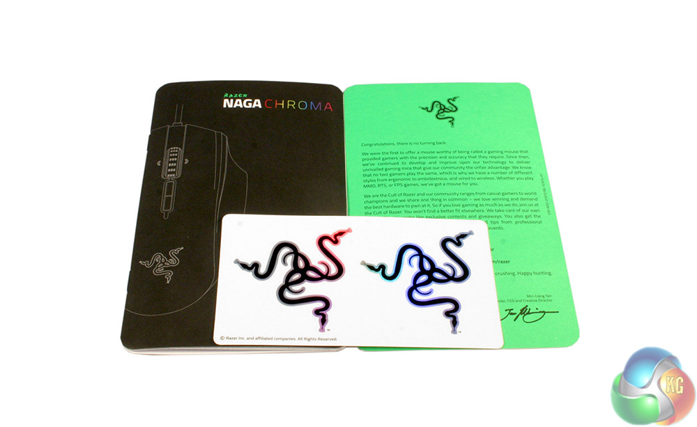 The rear goes into a little more detail and addresses those who speak other languages, so a single unified packaging is all that is required. Along with the mouse itself you receive the usual pair of stickers, a ‘welcome to the Razer club' note, and a quick set up guide.