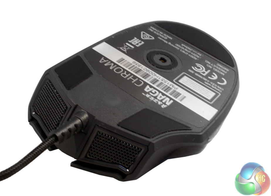 On the underside of the Razer Naga Chroma, we have a centrally located 5G laser sensor and a trio of PTFE feet. At the front end is a notable protector at the base of the cable, which should help prevent shearing over long-term use.