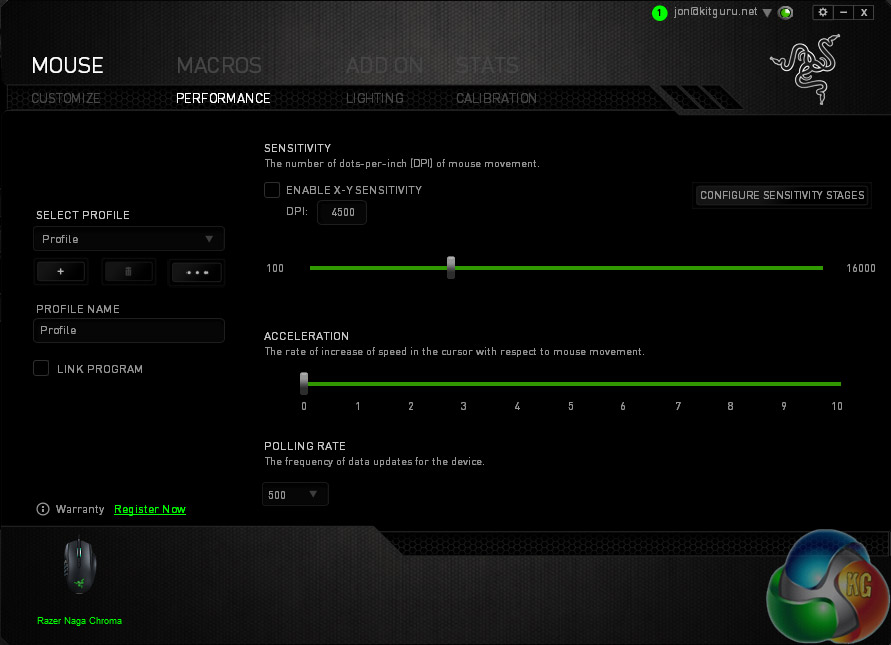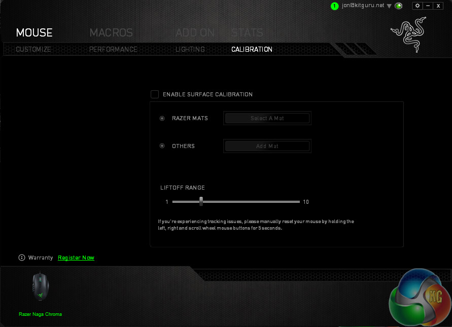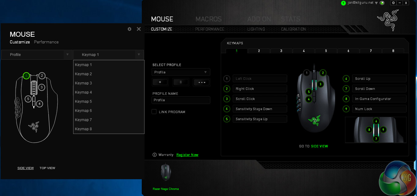 Better than that, there is an in-game configurator that can be turned on. When that is in play, a simple tilt of the control wheel (at default mapping) pulls up an overlay that lets you remap the mouse's functions without leaving the game. There were also no problems with the software forgetting things as it seemed to do with the recently reviewed Razer Orochi.