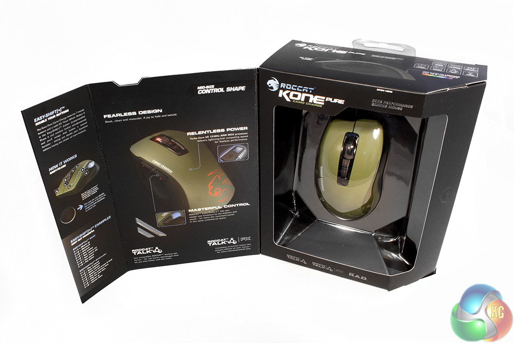 The packaging for the Kone Pure Camo Charge is classic Roccat: high quality, matt cardboard, with the mouse's main features listed in easy to read tabs on the front and written out in more detail on the back in a number of different languages.