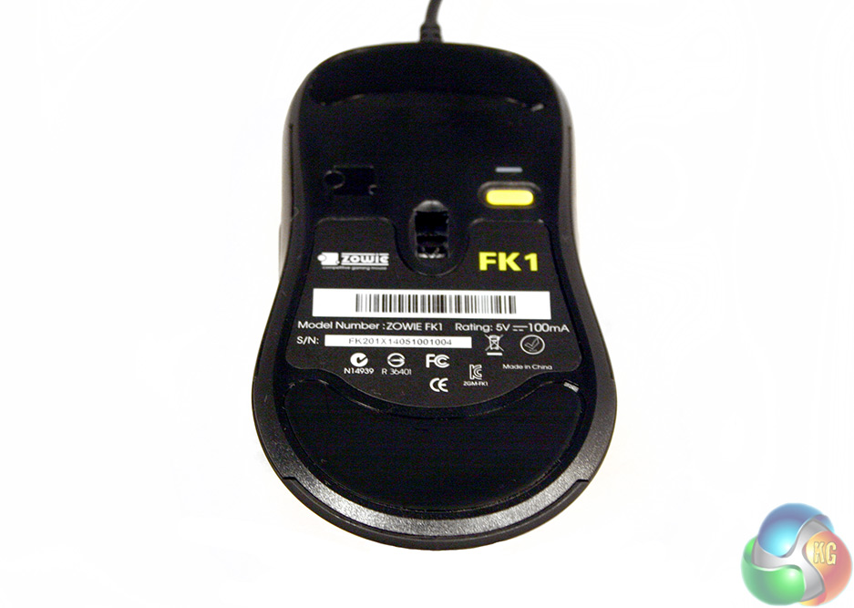 You will find the DPI switch for the FK1 on the underside, as well as an LED indicator to let you know what the sensitivity is currently set at (400, 800, 1600 or 3200). The optical sensor is located in the centre and there are two large, teflon (or the non-branded equivalent) pads, one at the front and one at the rear.
