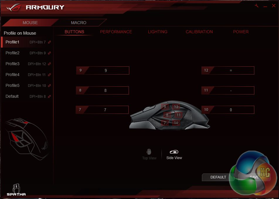 Upon installing the Asus armoury software, you will be greeted with the buttons menu, allowing you to assign specific functions to the many buttons on the mouse. You can switch between a ‘top view' and ‘side view', giving you access to buttons on different parts of the mouse.