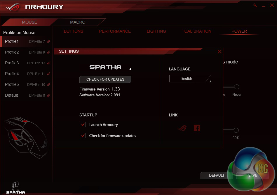 The settings window allows you to switch languages and update firmware. Upon first installing the Armoury software, you will be asked to plug the mouse in to update its firmware and then plug-in the dock to update that too but if you should ever need to update again in the future, this is the screen to go to.