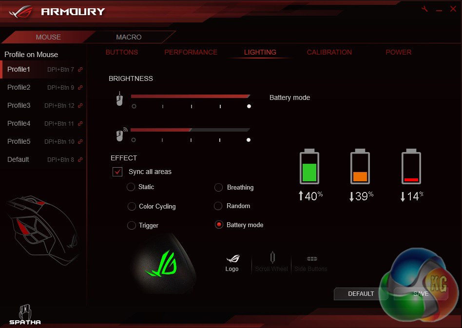 The ROG Spatha features three-zone RGB lighting, with LEDs found in the logo, scroll wheel, and behind the buttons on the side, with light shining through the gaps. There are several effects but I personally opted to have lighting correspond to battery life throughout my usage, rather than going with the spectrum cycle effect or sticking to any one colour in particular.