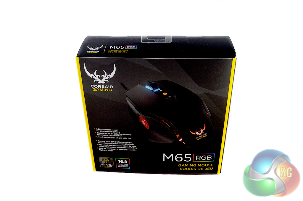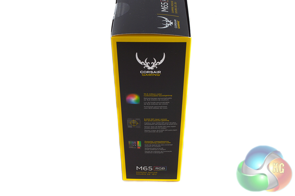 The Corsair Gaming RGB M65 Mouse comes in a regular square box with a yellow trim going down the sides. The front boasts several features, including the 8,200 DPI laser sensor and back lighting … which Corsair claims can produce 16.8 million colors.