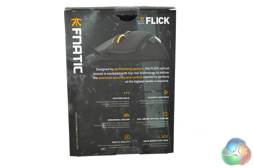 The Fnatic Gear Flick comes in simple packaging, with a view of the mouse on the front of the box and a rundown of what features to expect on the back. Features include things like the ‘pro-grade optical sensor', the drag reduction cord and ergonomic design.