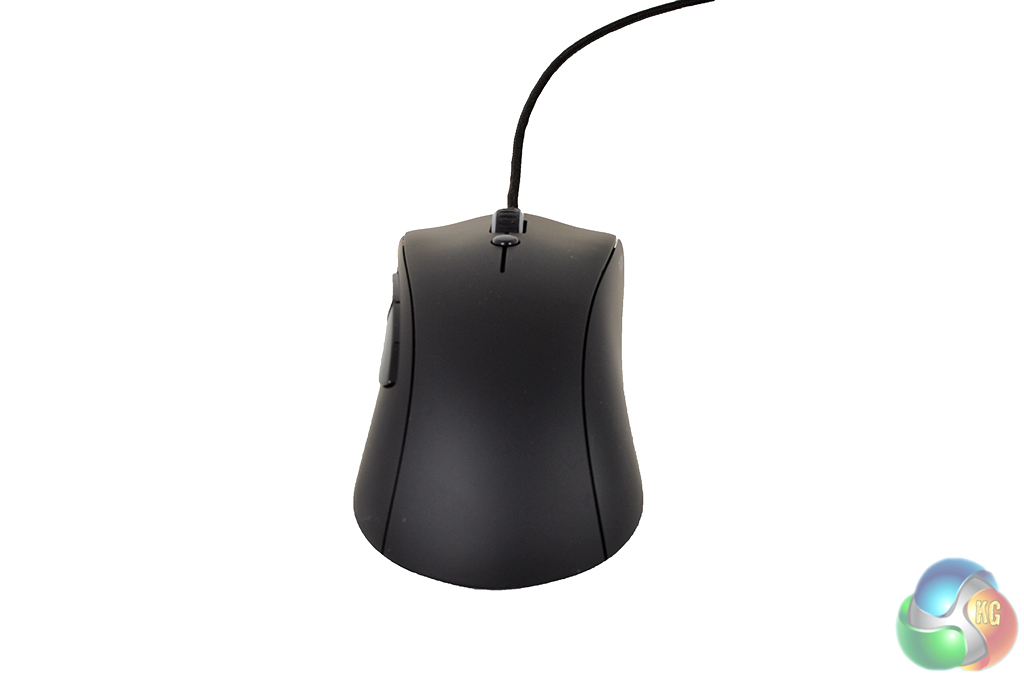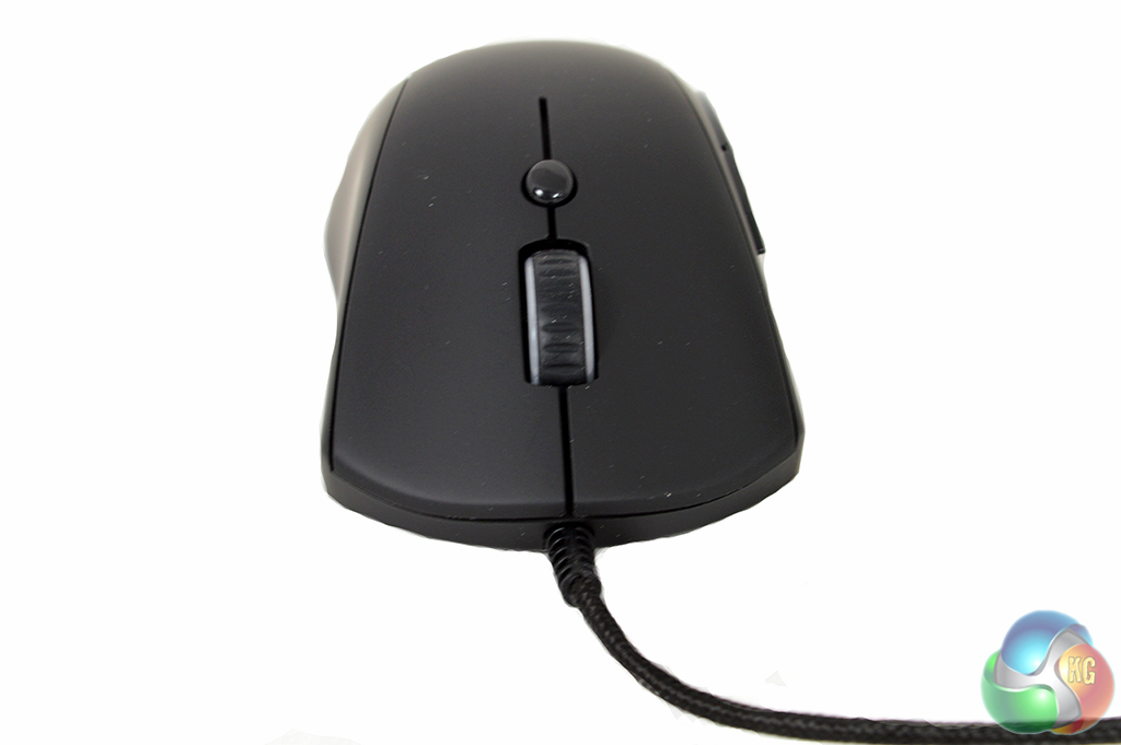 Looking at the mouse from the back, you can already see the curves in place on the sides. This design is intended to provide a more comfortable fit. At the front of the mouse you can see the scroll wheel, along with a single button used for profile switching.