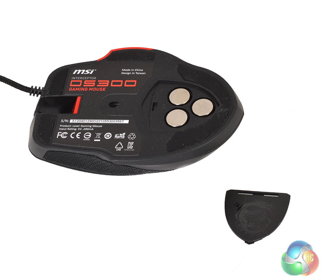 On the underside of the mouse, you will find a plastic cover for the weight adjustment system. There are three tiny 4.5g weights that you can take out or leave in, whichever you prefer and as always, this level of customization is highly appreciated. Finally, the DS300 also comes with a braided, gold plated USB cable.For