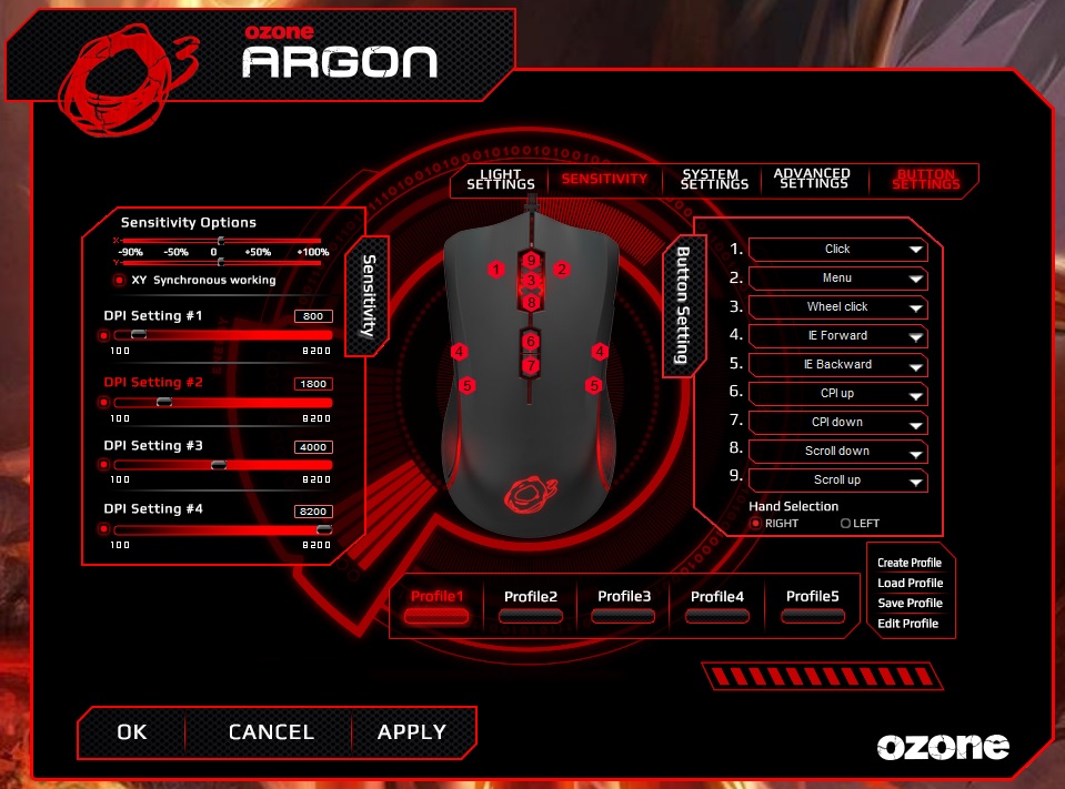 In the image above you can see the main window you are greeted with when first opening up the software. Here, you can make changes to the sensitivity options, create different button and sensitivity profiles as well as customising what each button does on the mouse.