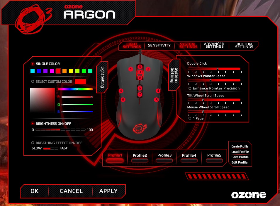 While the Argon is an RGB mouse, which should be capable of replicating over 16 million colours (though that number is debatable on pretty much any peripheral), it does lack a few of the fancy effects found on other mice. You only have one option here, which is for a ‘breathing' effect. You can also make changes to LED brightness and colour.