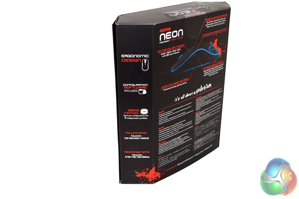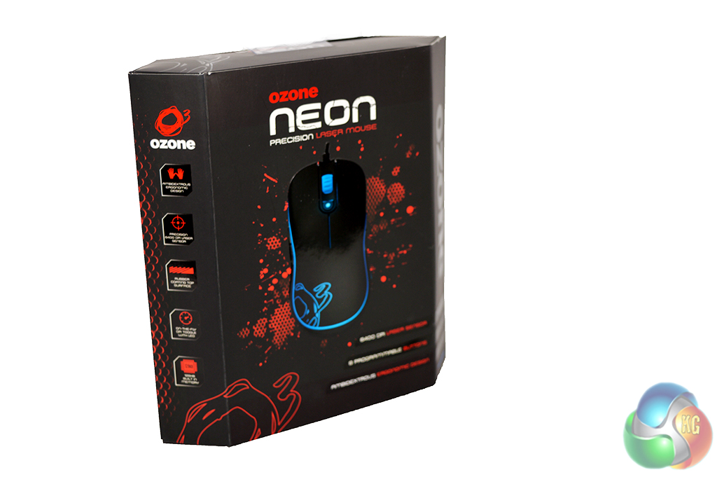 The Ozone Neon comes in a fairly standard box. The front shows off the mouse itself, while the back lists key features and specifications.