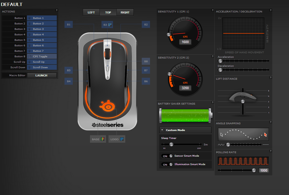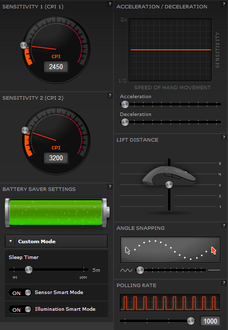 All of the options are crammed on to one window. You can see that the mouse defaults to 1,600 CPI before you hit the CPI toggle button and then 3,200 CPI afterwards.