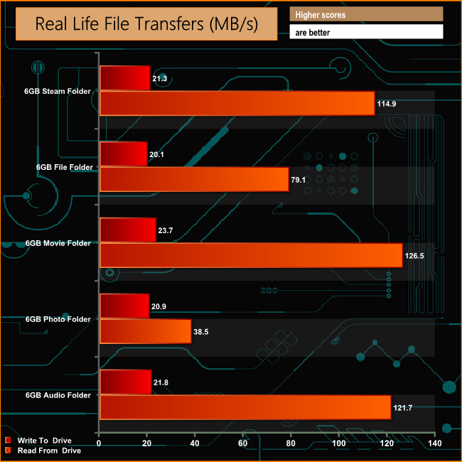 The darAshur PRO is very consistent when it comes to writes across all types of file transfers. When it comes to dealing with the contents of the Steam, Audio and Movie folders the read performance is very good. The reads tail off when dealing with the small bity files of the File folder and fall off a cliff when dealing with the contents of the Photo folder.