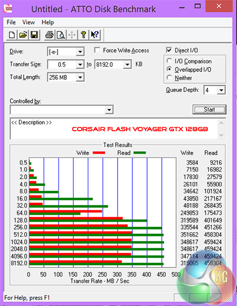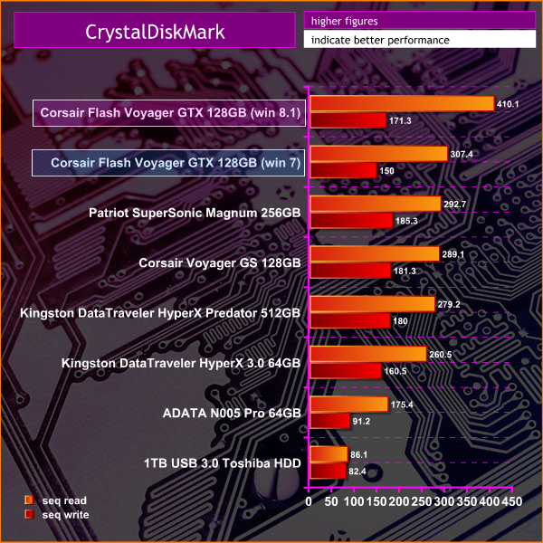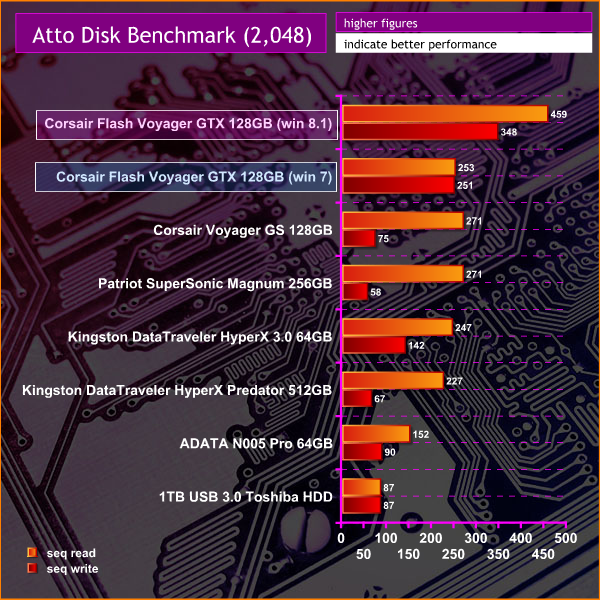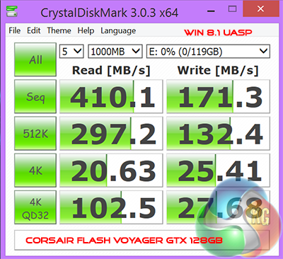 The Corsair Flash Voyager GTX 128GB is unquestionably top of the performance chart. With the UASP driver operating in Windows 8, performance is dramatically boosted to 459 MB/s and 348MB/s in the sequential read and write tests respectively.