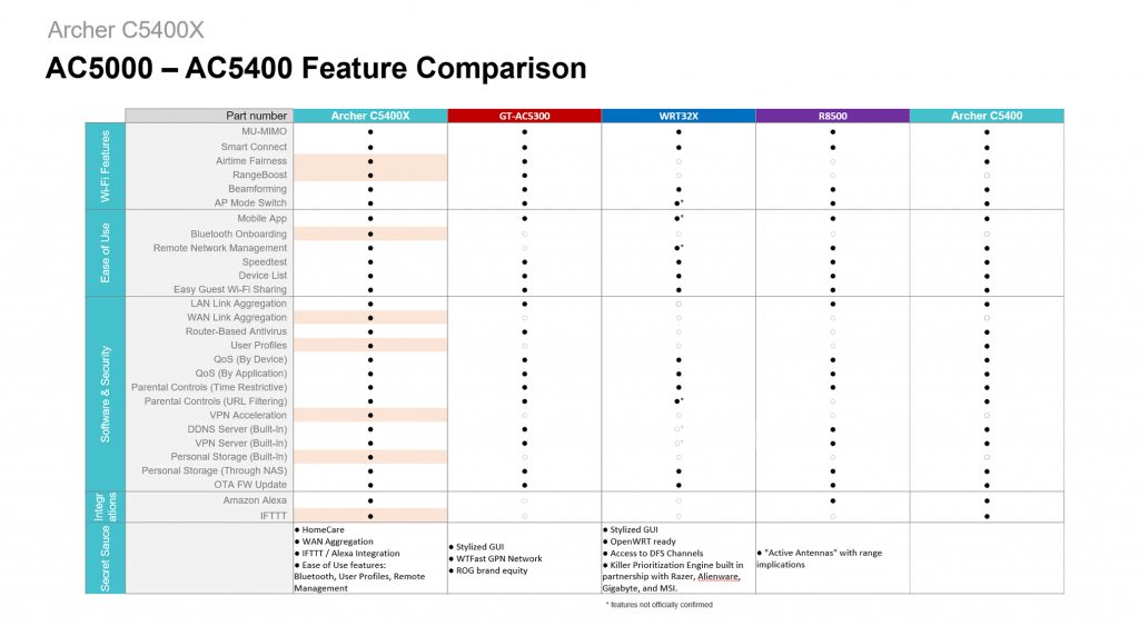 This should support up to a staggering 192 separate devices, however Fernandes states that performance might begin to vary after 80. RangeBoost is included to ensure that each device maintains its connection to the C5400X despite the variety of factors that often impede Wi-Fi, while Smart Connect helps to “divert traffic to one device to deliver optimum connection when needed.”