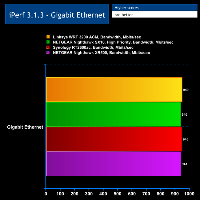 As you can see, all the routers and the Nighthawk SX10 gave pretty much the same result, which equates to Gigabit Ethernet wire speed. You never get the full 1000Mbits/sec from Gigabit Ethernet. This test shows that the Nighthawk SX10 is performing as expected. We didn't have two clients with 10Gbit Ethernet ports (or the Cat 6 cabling required to go with this), so weren't able to test the performance of these ports.