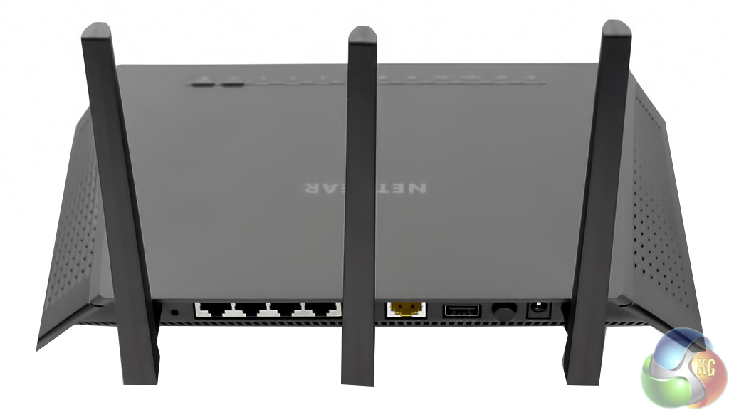 At the rear of the router we find (from left to right) a reset pinhole, four Gigabit Ethernet LAN ports, Gigabit WAN Ethernet, a USB 2.0 port for printer support, the power button and a jack point for the power supply. The three chunky antennae are arranged to give you plenty of clearance to connect the cables.