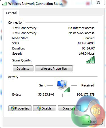 To set a baseline the laptop was connected to the Netgear R7000 using Ethernet cable to see whether we got a figure any near the theoretical 1 Gigabit. Downloading a 2GB movie file ran at a steady 519.5Mbps while the upload was slightly slower at 472.0Mbps.