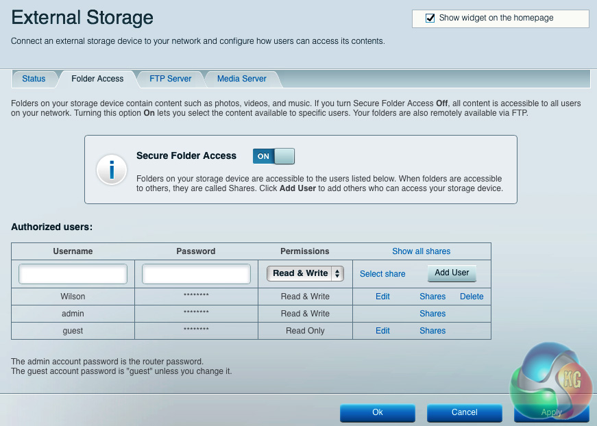 This router also comes with a pretty nifty external storage feature, which allows you to plug an external storage device in to the router and create a media server for local devices. You can create specific shared folders and restrict access on certain devices on the network. You'll also be able to set different username and passwords.