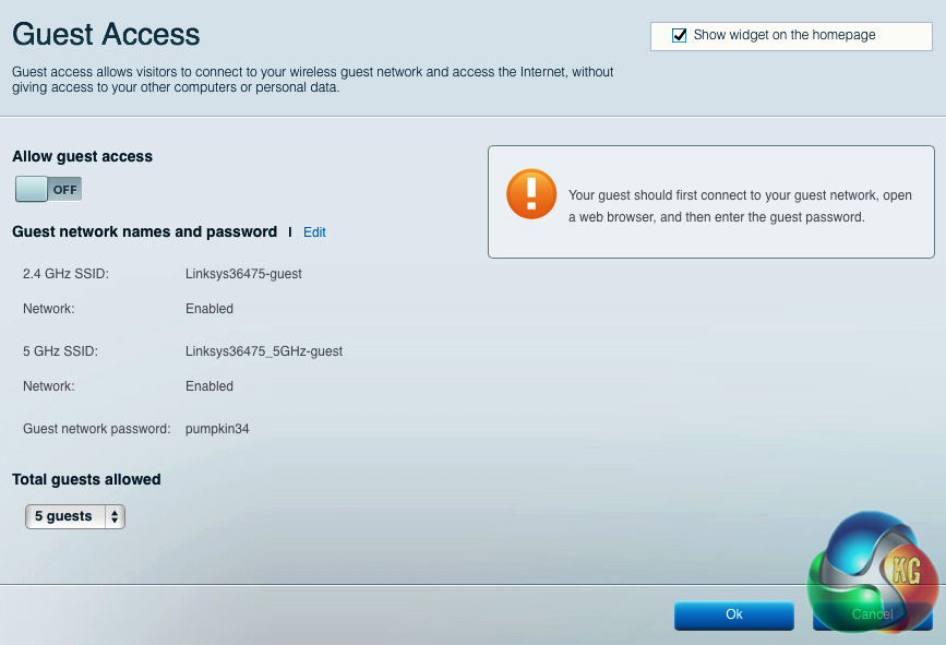 Guest access can be turned on or off and you can cap how many people can have access. This network shows up separately and has its own unique password.