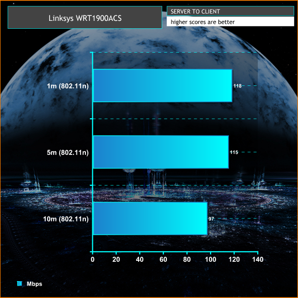 We use the WiFi Perf software, which measures both client-to-server (c2s) and server-to-client (s2c) performance, and we tested both 802.11n and 802.11ac at 1m, 5m and 10m with direct line of sight to the router.