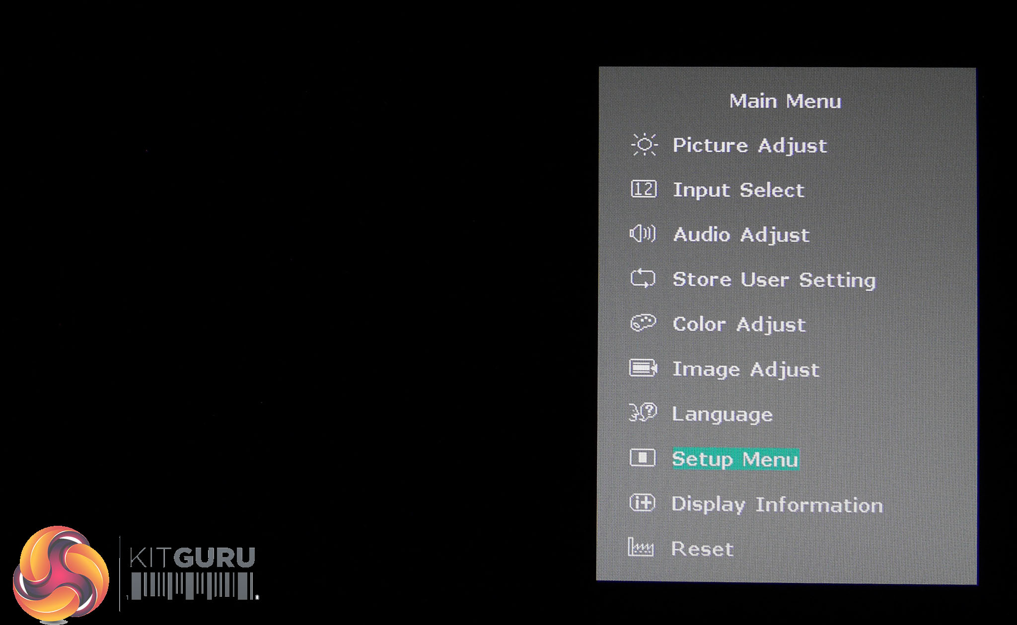 Moving on to the other main menus in the OSD, we have the aforementioned Input Select; Audio Adjust which lets you adjust volume, mute/unmute and choose the digital audio source; and Store User Setting for the three user modes (did this really require a separate menu entry Iiyama?).
