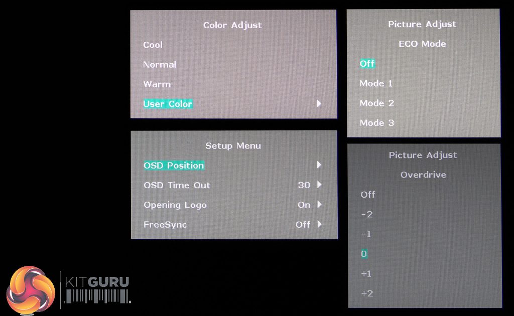 In Picture Adjust, you’ll find controls for Contrast, Brightness and Overdrive, the latter of which offers a few more presets than the usual normal/fast/faster. Instead Iiyama here offers Off/-2/-1/0/+1/+2. This is a little confusing as the user might be left wondering what the difference is between Off and the default 0, or why a setting that traditionally increases something (the overdrive applied to the liquid crystals that make up an LCD panel) even has minus figures to begin with…
