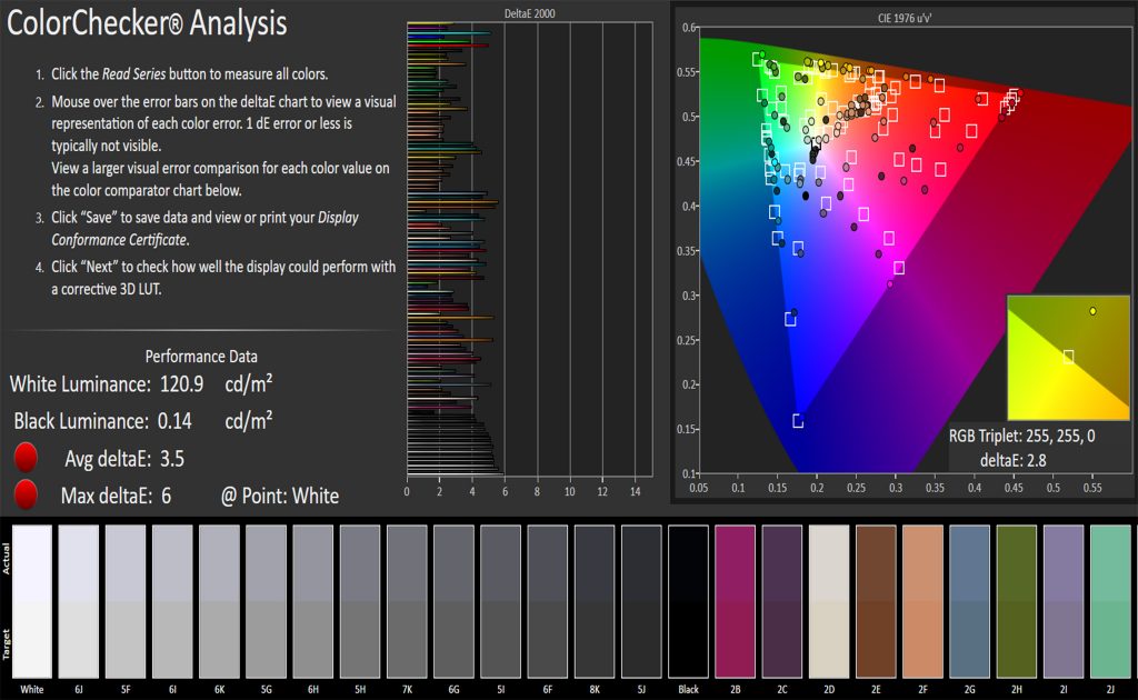 For a more detailed and objective evaluation, we use an Xrite i1 Display Pro with DisplayCAL and CalMAN Colour Checker software to assess the panel’s contrast and colour performance, uniformity, and image quality. Please keep in mind that these results should only be used as a guideline: not only is every panel different to some extent, but a number of factors can affect measurements such as environment temperature, display warm-up time, and many others.