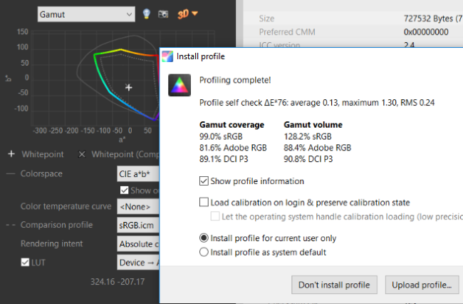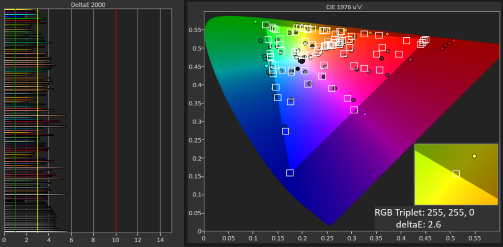 We measured 99% sRGB, which is as expected since our software doesn’t show coverage above 100% and this is within margin of error. Due to equipment limitations expanded colour spaces are always measured with a slight loss, so our figure of 89.1% DCI-P3 means the monitor is likely to be covering above 90%. That’s a very impressive result indeed, and the by far best we’ve seen on a display this affordable.