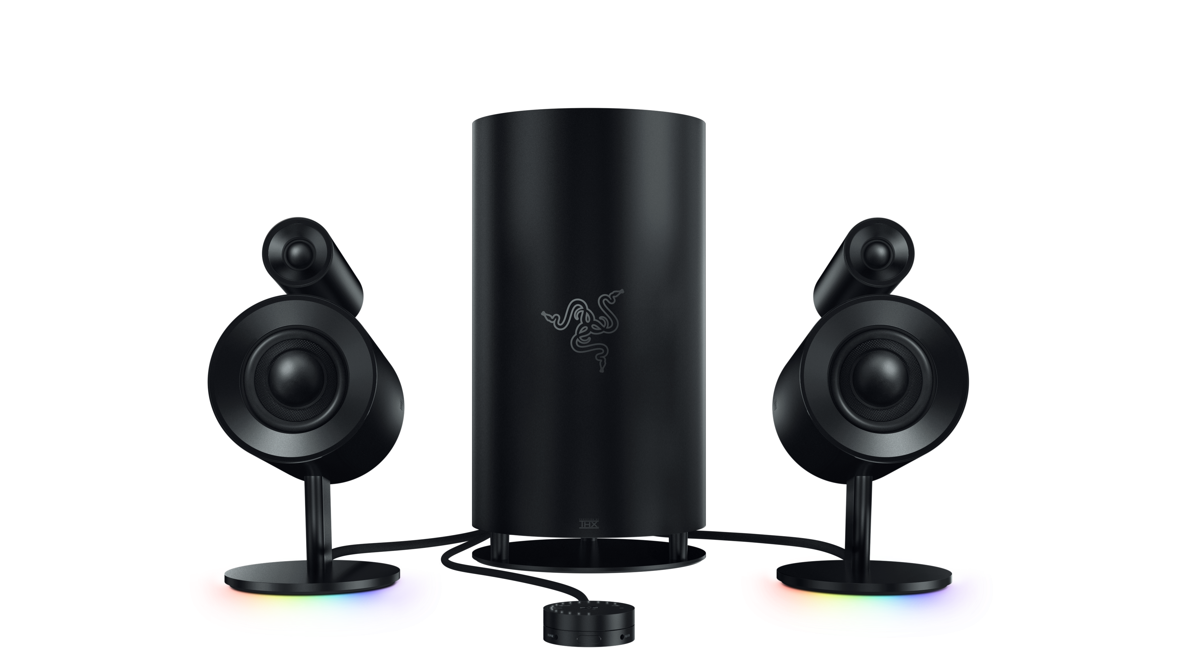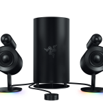 The Razer Nommo Pro is the top tier 2.1 speaker system with Dolby Virtual Speaker technology, certified by THX. This comes with all the trimmings on the lower-tier models, such as Razer’s Chroma RGB lighting at the base of the two side speakers, as well as a control pod and a 6-inch subwoofer emblazoned with Razer’s intertwined snake logo.