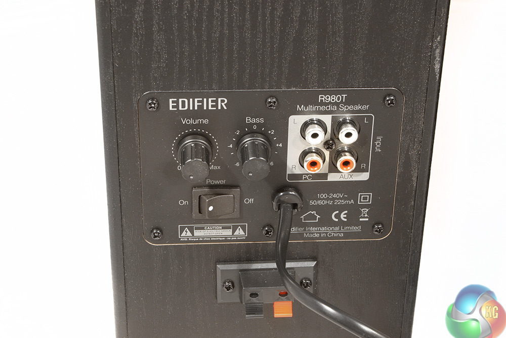 Around the back of the speakers, you have all your connectors, controls and power connectors. There is a standard UK plug for powering up the internal amplifier, and the four phono connectors for the audio inputs. Right alongside those are a pair of dials to adjust bass and master volume, as well as a power switch.