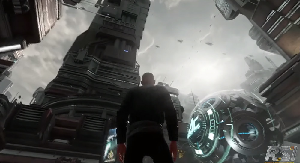 In-case you can't (or won't) watch the above video, the sequence begins with Roberts Space Industries' Chris Roberts, guiding us through the atmospheric entry procedure, which involves getting clearance from the local populace. The player on-screen then goes through a transition into the atmosphere, before touching down and being sent out into the warmth of an industrial starship dock.