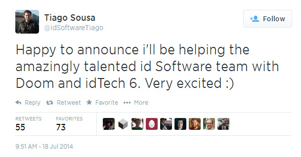 Announced by Sousa on Twitter (he even went so far as to change his handle to reflect his new employment), the notice made it very clear that he would be contributing towards the development of the hinted at and teased Doom reboot, along with the engine that powers it, idTech 6.
