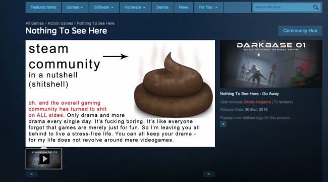 If you happened to come across the store listing yesterday, the game's page had been retitled to ‘Nothing to See Here', the screenshots and trailer have been removed and in its place there is a picture of a turd alongside a rant at the Steam community.