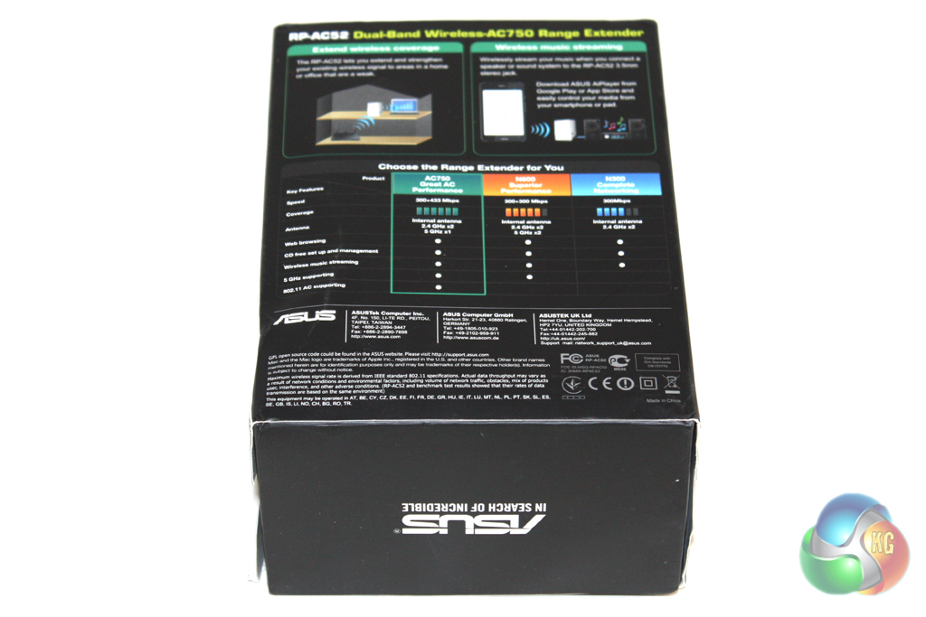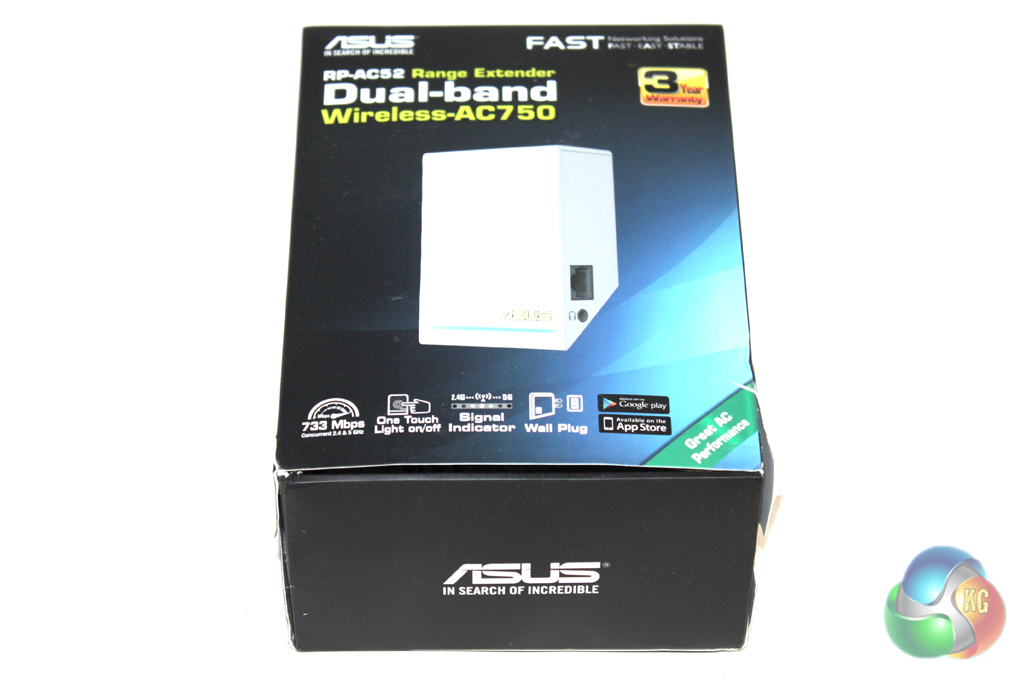 The ASUS RP-AC52 is supplied in a compact box, decorated in an attractive black and blue livery. The front of the box features a large image of the product itself, alongside a basic outline of the features.