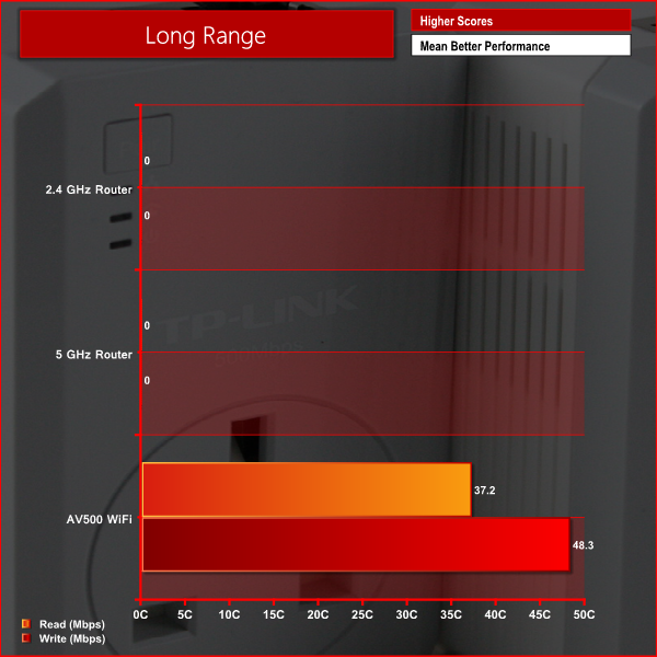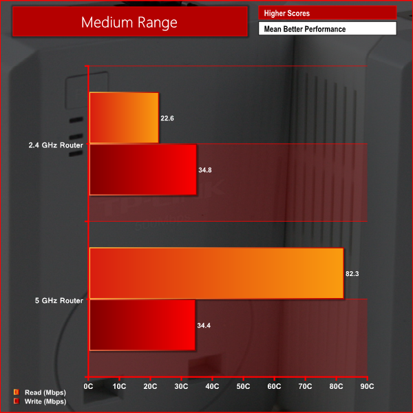 As we can see from the graphs above, we experienced far superior performance at short range on the 5 GHz band in both the read and write tests. At medium range, read performance remained superior on the 5 GHz band but write performance was similar to 2.4GHz. At long range, we weren't able to connect to the router on the 5 GHz band and received a very weak signal on the 2.4 GHz band – although this wasn't enough to complete our tests. We did however experience strong performance from the range extender at long range.