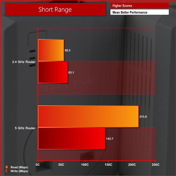 - Short Range: Router positioned with the ‘client’ laptop three feet away, to show the best performance scenario.