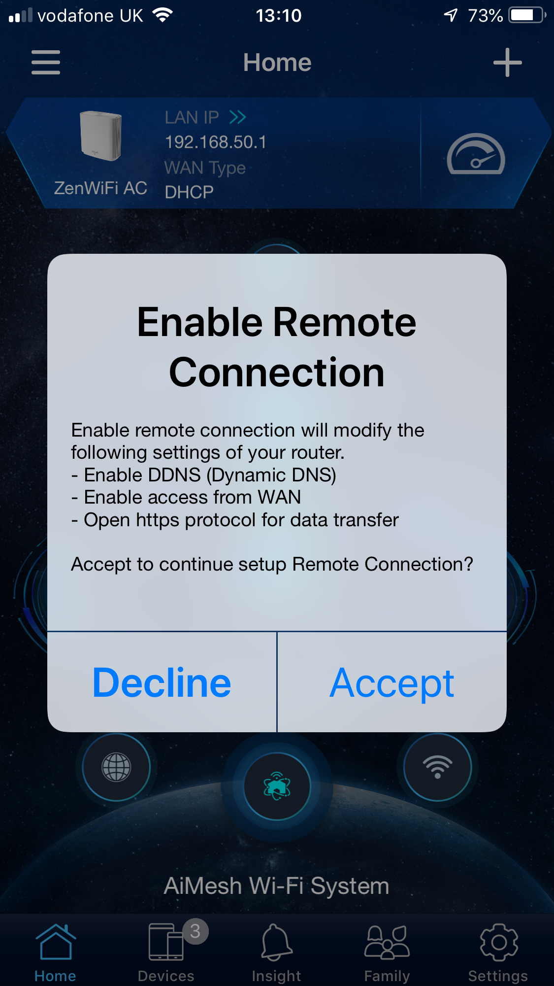 You're then taken into the app interface proper, with some T&Cs to agree to and the option to enable remote management. The first thing you'll notice when you're through these stages is that there is a lot more to do here than most smartphone apps for controlling routers. You can drill down to the router and satellite, and even reboot them.