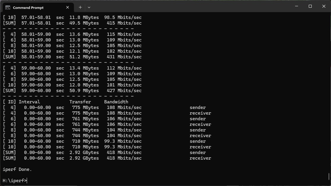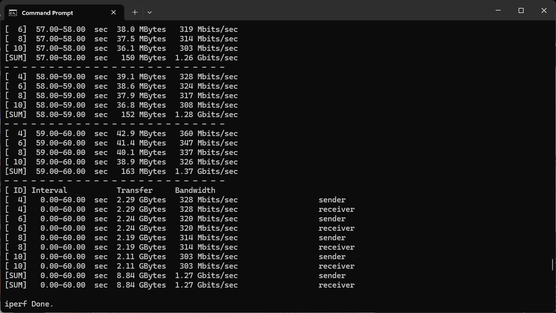 We used the open-source iPerf 3.1.3 software for testing, which can simulate multiple clients streaming at once. Three Windows systems were employed. Our desktop base was an Armari 32-core AMD Ryzen Threadripper workstation running Windows 11. This was connected to the router with a 10Gbit Ethernet card, attached via Cat6 cable to one of the ASUS router's 10Gbit Ethernet ports.